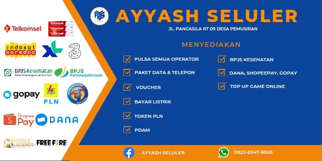 Ayyash SelulerAlamat : Jl. Pancasila RT.09 Desa Pemusiran Ayyash Seluler menyediakan pulsa/paket data/telp all operator, bayar/token PLN, BPJS, DANA, Shopeepay, Gopay, Topup game, dll. Hubungi Penjual |