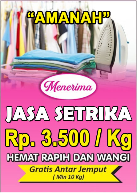 Jasa Setrika AmanahAlamat : Jl. Pancasila RT.10 Desa Pemusiran Menawarkan jasa setrika dengan tarif Rp. 3.500 / Kg. Ongkir antar jemput Rp. 2.000. Untuk pesanan di atas 10 Kg gratis ongkir. Buat Pesanan |